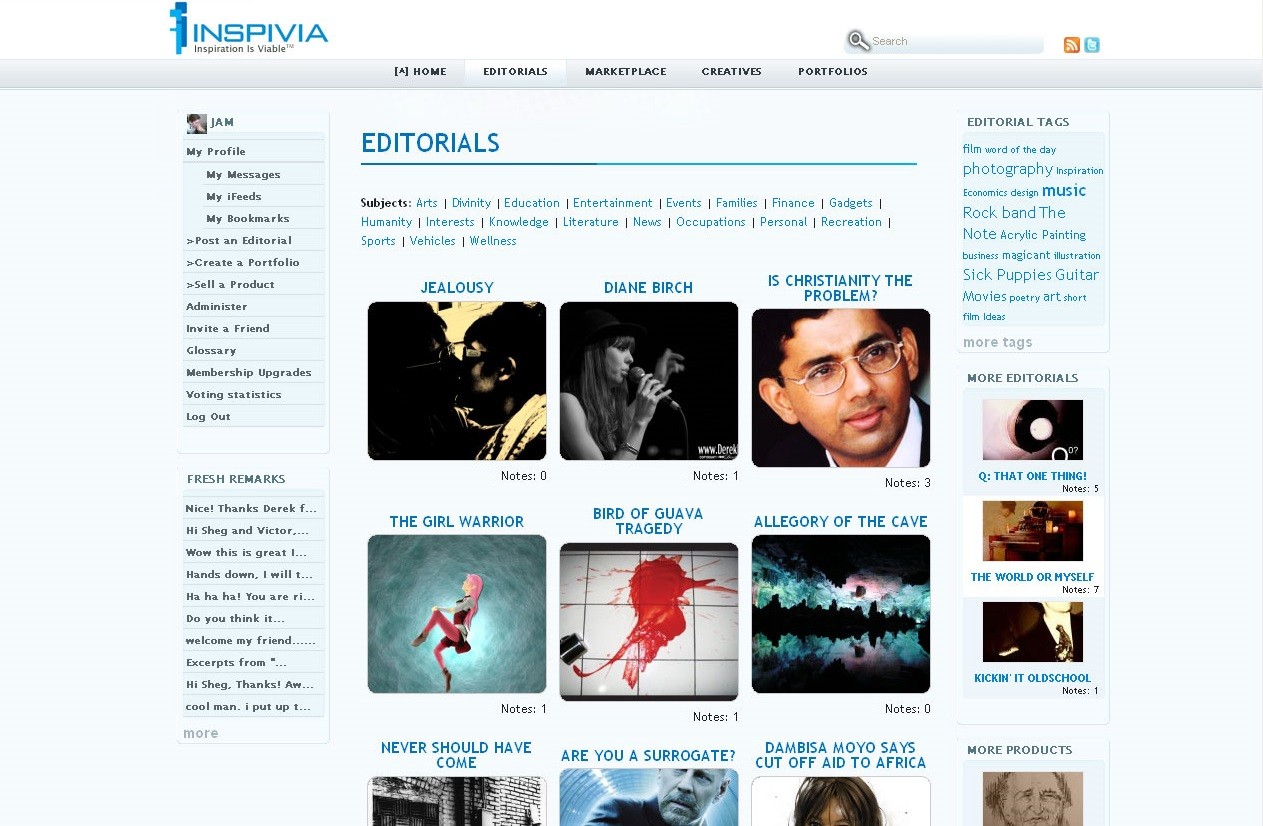 Inspivia was a Drupal-powered social platform created under the leadership of Sheg Aranmolate. Inspivia was later replaced by Sheg's blog. For a short while, the site featured many similarities to Facebook and Myspace but tried to cater more to artists. I was in charge of creating both the visuals and the functionality.