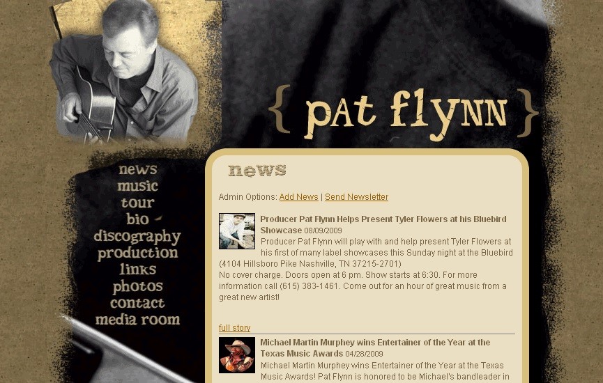 Pat Flynn Music was originally hosted on a music service network that was closing its doors. Pat hired me to move the entire site to a new host and build a new backend for the data. Everything was scrubbed manually from the old host, which did not allow access to the source code or database at all. I rebuilt the site in Drupal and developed a custom theme to recreate the design they had with the old host. Some design freedom was afforded to me, so I designed some additional admin shortcuts into the layout and added some gallery features.